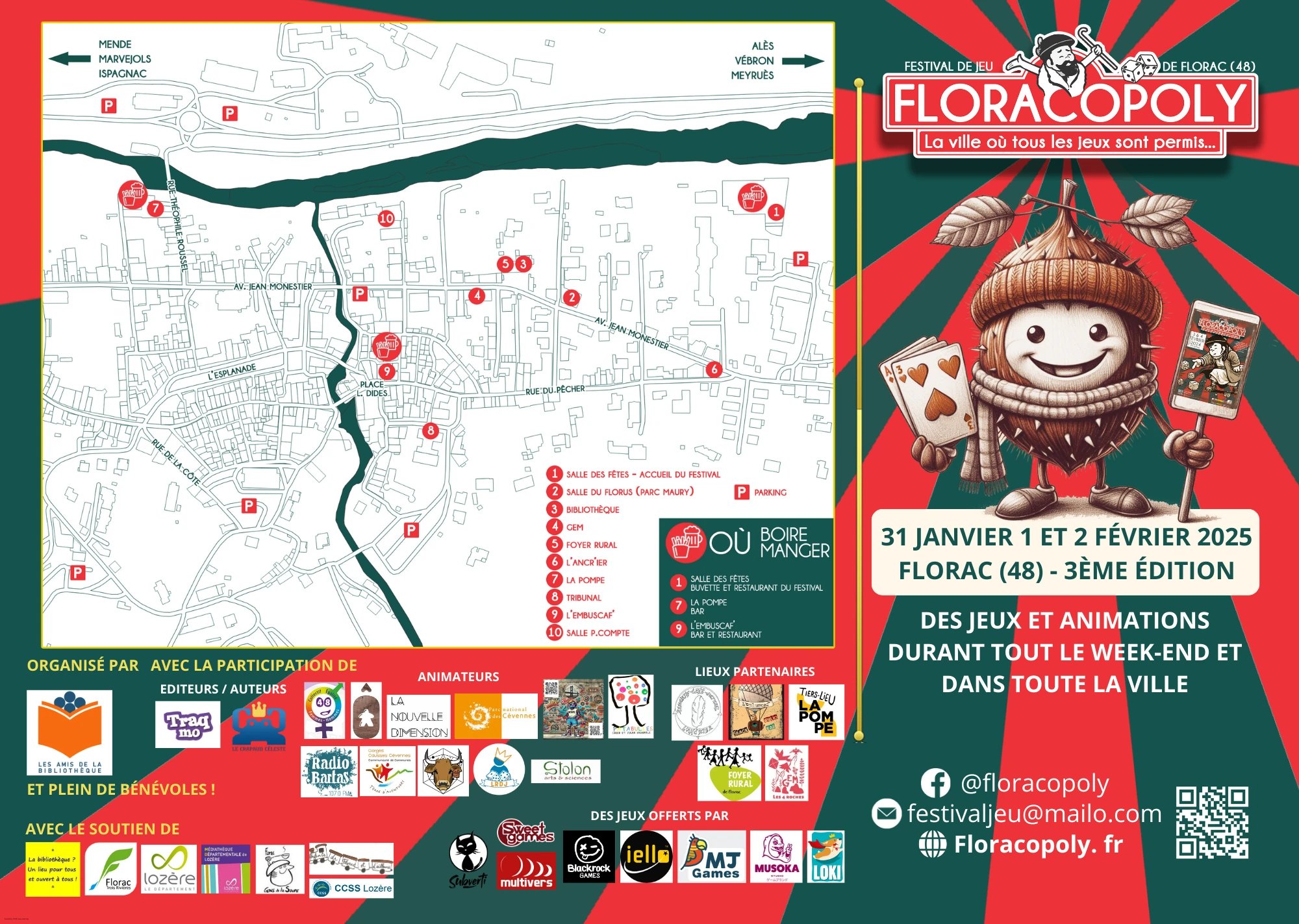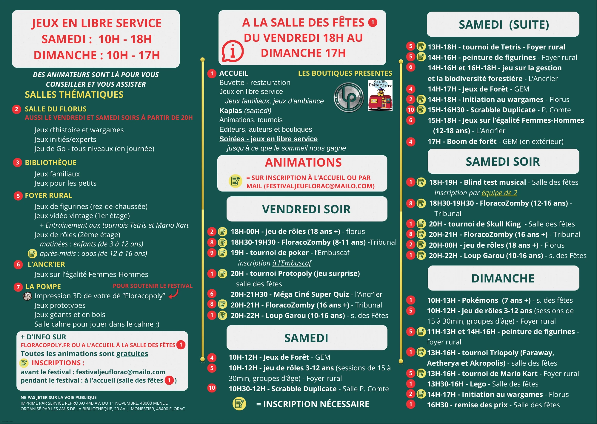 - Dans 10 Lieux socio-culturels de Florac: La Médiathèque de Florac, l’Ancien Tribunal, la salle des fête et 2 autres salles municipales, L’Ancr’ier, le GEM, Le Foyer Rural, L’Embuscaf’ et La Pompe